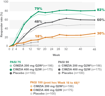 • PASI 75: Placebo (n=49) 13%; CIMZIA 200 mg Q2W (n=91) 81%; CIMZIA 400 mg Q2W (n=87) 82%